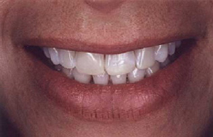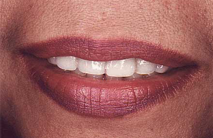This woman's front eight teeth were crowned and she was very self-conscious and unhappy about how she looked. Her gum tissues were extremely swollen around these crowns and her teeth looked very bulky and unnatural. Her dentist told her this was "the best cosmetic dentistry available today." After corrective gum tissue therapy followed by six months of gum tissue healing, along with 12 new Empress 2 All-Porcelain Crowns, her new smile reflects how great she feels about her teeth. Her new teeth look exquisitely natural, her gum tissue is completely healthy, and her smile is always showing! The difference in Cosmetic Dentistry techniques is quite obvious now!