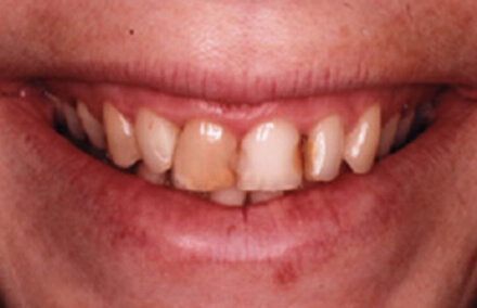 This woman was not happy with her smile and how her teeth looked. Her gumline was uneven and her teeth had internal tetracycline antibiotic discoloration. She was self-conscious about her smile and desired a more attractive smile. After recontouring her gumline and restoring her upper front teeth with Porcelain-to-Gold Crowns, her new smile completely transforms her appearance and radiates a beautiful glow to her face. She is thrilled with the result and now smiles constantly!