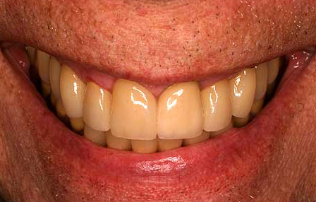This man did not show much of his teeth when he smiled due to years of excessive wear on his upper teeth. By having Porcelain Veneers placed on his upper six teeth, his smile was redefined and his worn down teeth were lengthened and strengthened.